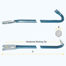 Used for demolition, removing nails, framework, studs and walls. Carbon steel with black powder-coat finish. Double-ended, curved-head pry bar, Straight end: 15°, Curved end: 85°. Tear drop style nail slot 1-1/16Lx1/2~1/16W. Straight end: 1-5/8W; Curved end: 1-1/4W. Overall dimensions: 17-3/8Lx1-5/16Wx2-7/8 deep.